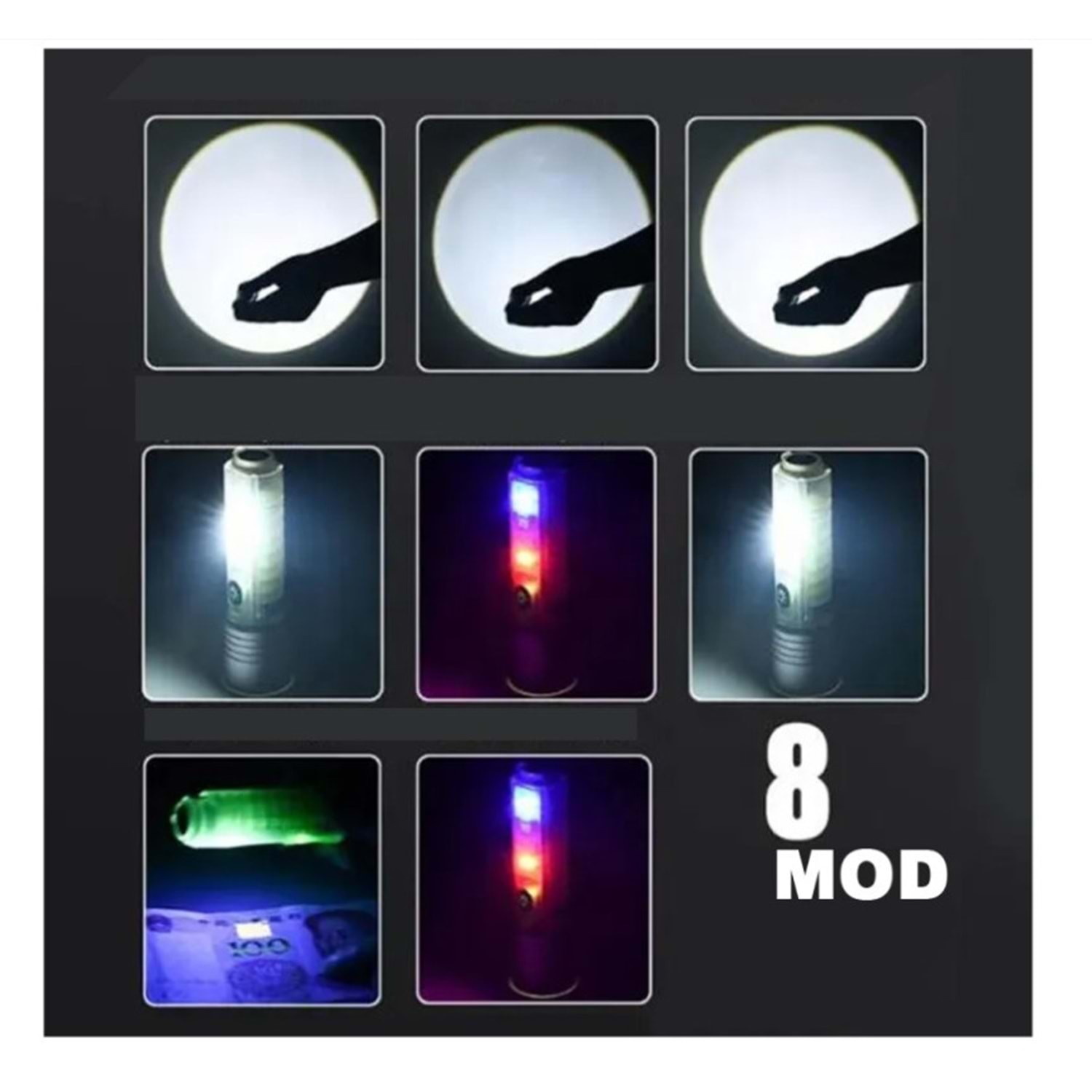 Boyutlar :13 cm- 3 cm Işık Özelliği : 1 TG Güçlü Led + 12 Parlak Led Ampül Işık Rengi :Beyaz,Kırmızı , Mavi ( Polis Çakar ) Aydınlatma : 8 Modda Aydınlatma Çalışma Süresi :15 Saat Aydınlatma Gövde Malzemesi :Kavuçuk, Metal Alüminyum Kullanım Özellikleri :Mıknatısı ile Sabitlenebilir ,Askısı ile asılabilir ve Masa Üstü Kullanım Özelliği , Oto Tamirinde , Teknik Özellikleri : 220 V İle Şarj Ediliebilir Type-C Uç İle Kutu İçeriği :Ürün , Ürün Şarj Kablosu, Taşıma Askısı Ampül Ömrü :100.000 Saattir Kullanım Yeri :Av, Kamp,Ev, Okul, Araba, Otel, Restorant Tasarruflu Enerji Harcama Özelliği Önemli Uyarılar :Direk Göz İle Temas Ettirmeyiniz Kullanım esnasında pratik kullanım için,mıknatıs yardımıyla kaportaya tutturabilirsiniz.