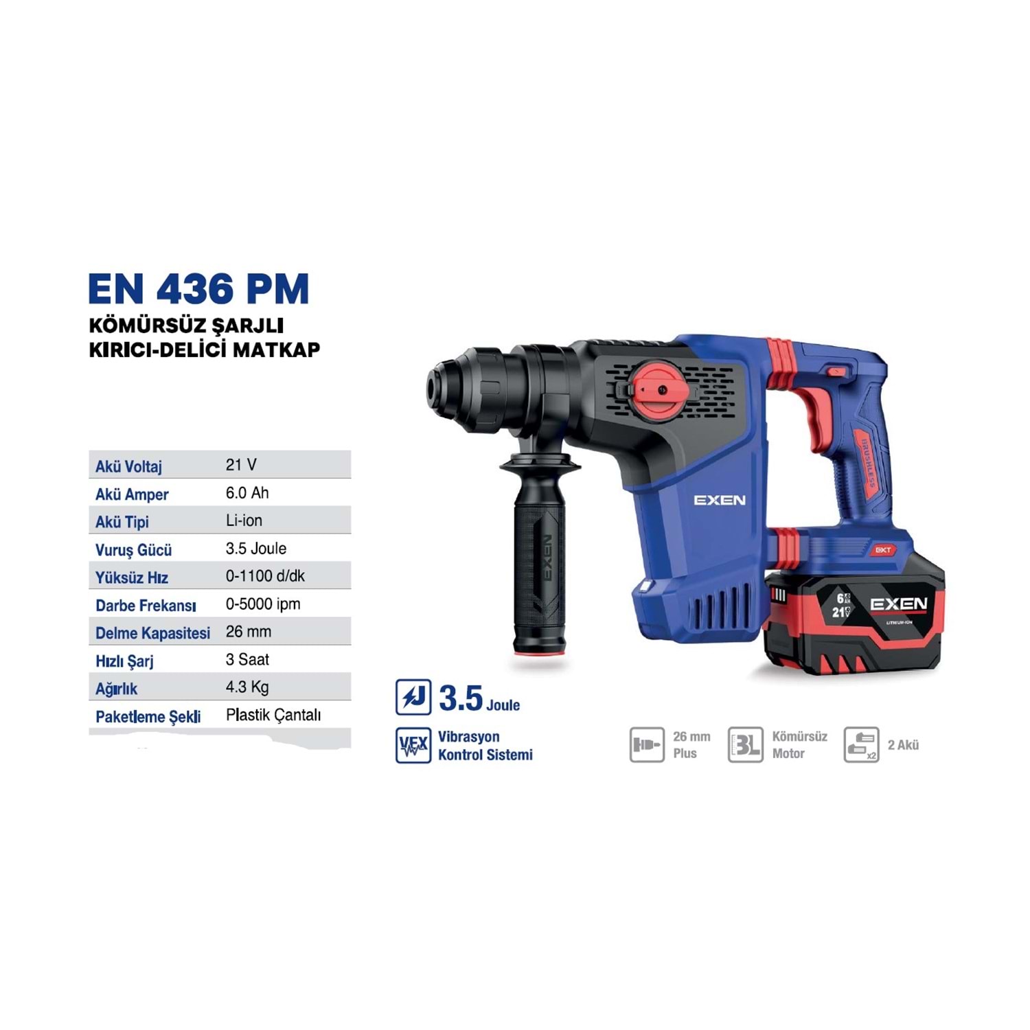 EXEN KÖMÜRSÜZ ŞARJLI KIRICI DELİCİ 436 PM 21V 6AH 3.5 J. 2 BATARYA
