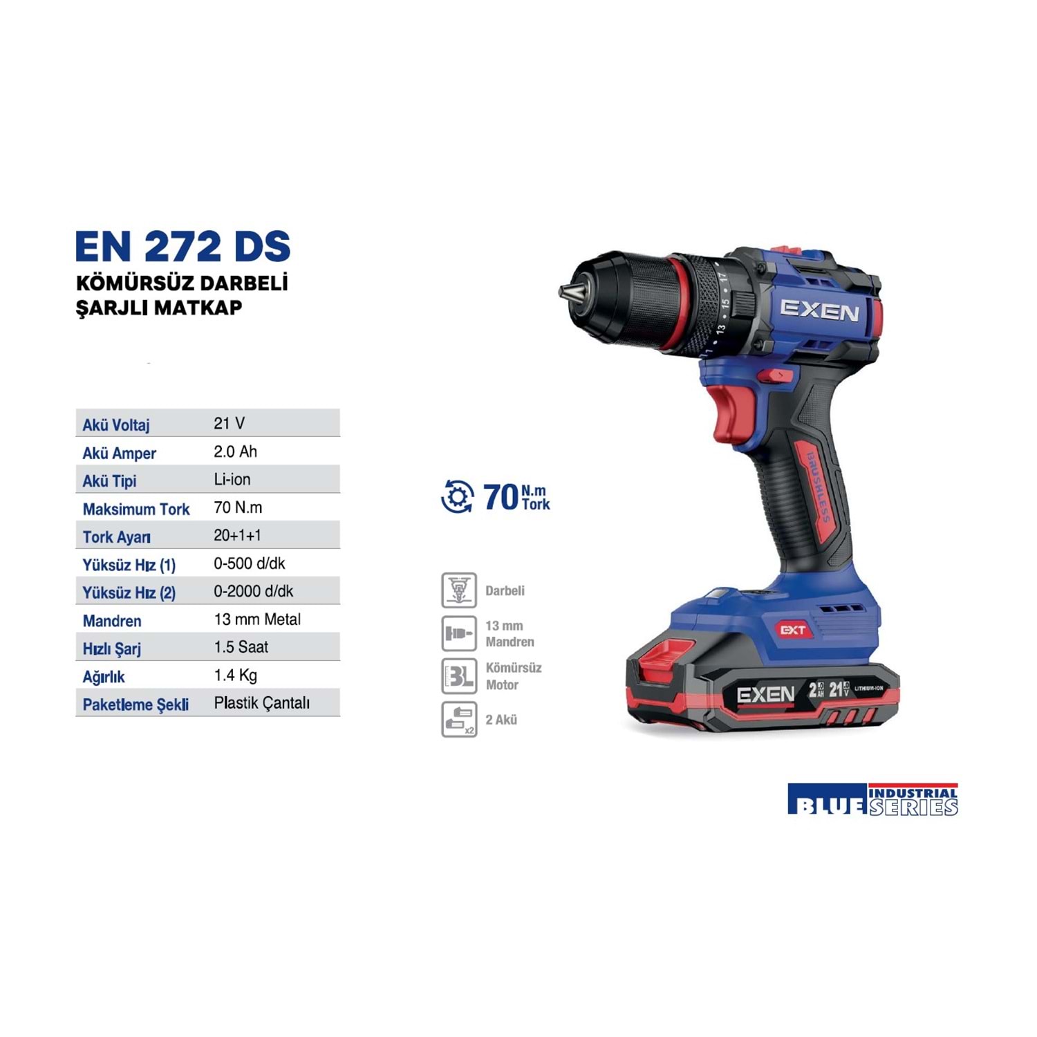 EXEN KÖMÜRSÜZ ŞARJLI MATKAP 272 DS 21V 2AH 70NM 2 BATARYA